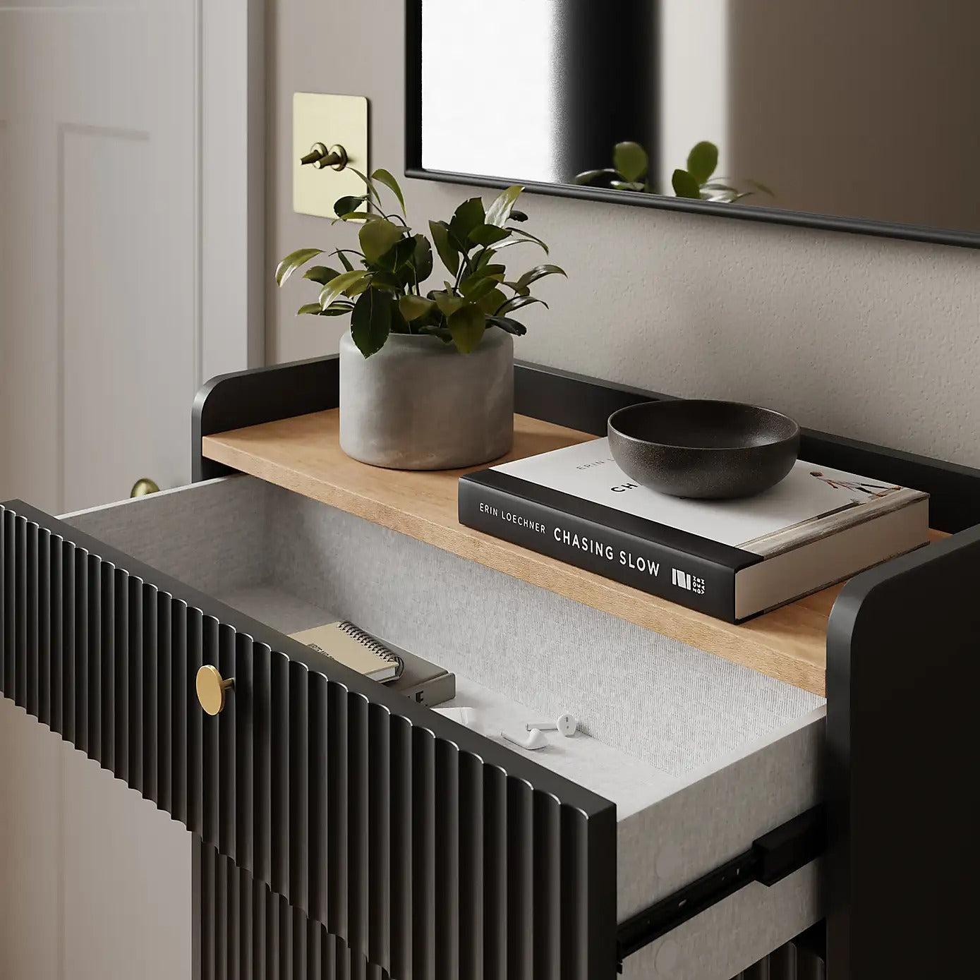 Top drawer storage: Perfect for smaller essentials like keys, socks, or shoe care items.