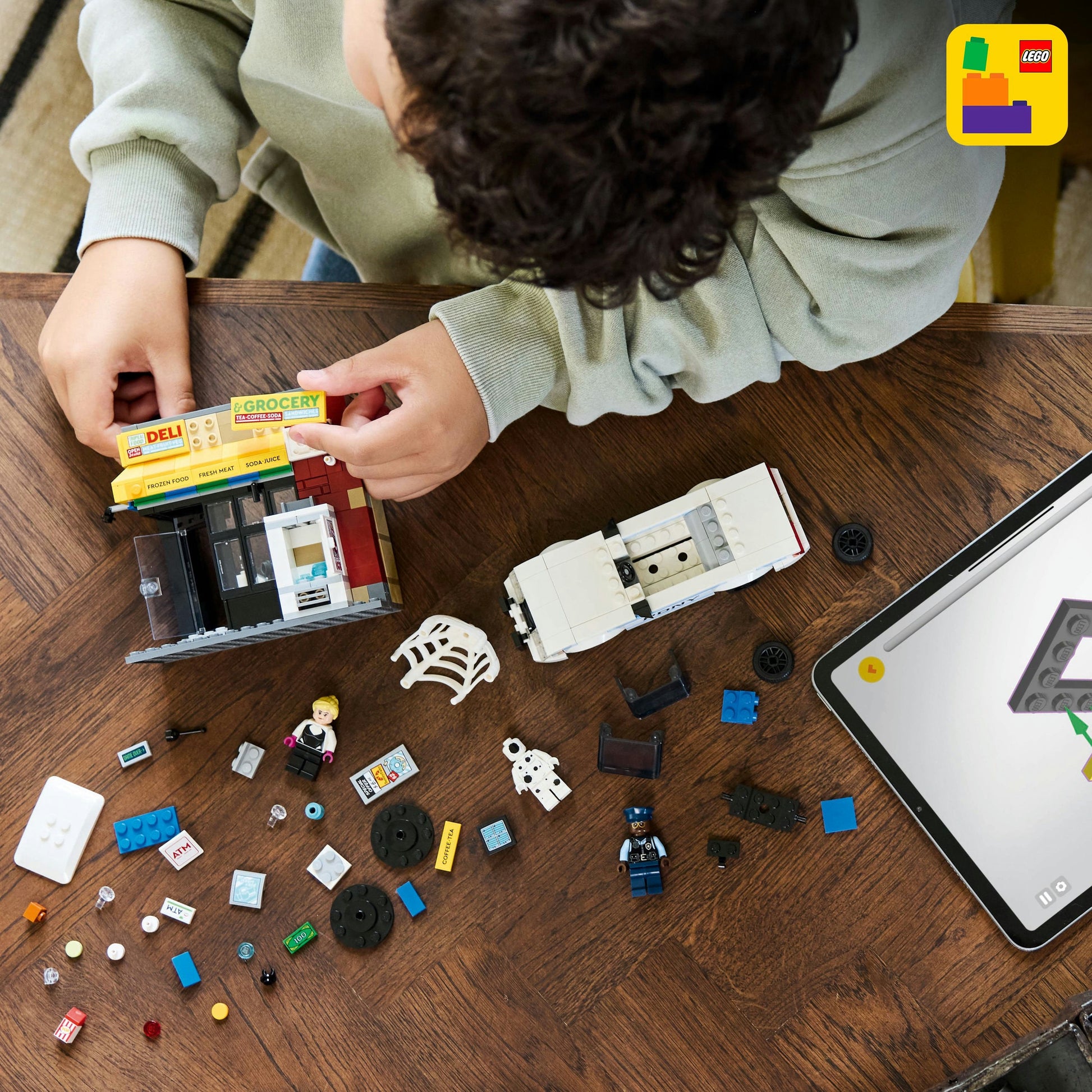 The Spider-Man playset comes with 4 minifigures: Miles Morales, The Spot, Gwen Stacy and Officer Jefferson. The convenience store has an exploding-wall feature that allows the ATM to be removed. Accessories include a long, flexible web rope and a flexible web that is large enough to encase a minifigure. The police car opens to allow 2 minifigures to be placed inside. For added digital fun, builders can zoom in, rotate models in 3D and track their progress using the fun, intuitive LEGO Builder app.