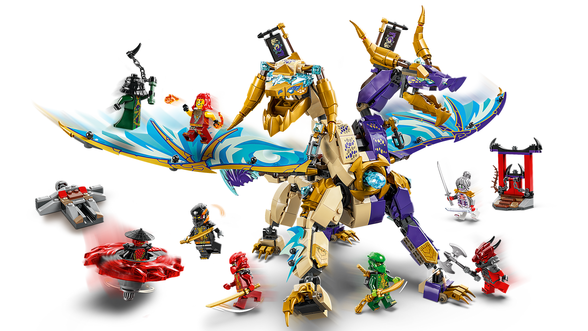 Der LEGO NINJAGO Lichtbogendrache (71836) lässt Jungen und Mädchen ab 9 Jahren legendäre Actionszenen aus der 3. Staffel der TV-Serie NINJAGO Aufstieg der Drachen nachstellen. Das Bauspielzeug beinhaltet einen 2-köpfigen Drachen, der Schwanz, Kopf, Hals, Kiefer, Beine, Füße und Klauen bewegen kann. Kinder können den Shooter in seiner Brust aktivieren und seine großen Folienflügel mithilfe des Hebels am Rücken vor und zurück schwenken. Dieses actionreiche Spielset beinhaltet 8 NINJAGO Minifiguren, um Ninja-Fans spannende Abenteuer darstellen zu lassen. Die Ninja-Helden Lloyd, Cole, Wyldfyre und Kai sowie ihr Verbündeter Pixal sind bestens ausgerüstet, um es mit den Bösewichten Drix und Zarkt und einem Drachenkämpfer aufzunehmen, die ebenfalls für jedes Duell gerüstet sind. Für noch größeren Spielspaß beinhaltet das LEGO Set mit Spielzeugdrachen auch einen coolen Spinjitzu-Spinner. Kinder können eine Figur in diesen Kreisel setzen und einen Knopf an dem dazugehörigen Startkatapult drücken, um ihn loswirbeln zu lassen. Wenn er auf sein Ziel trifft, können 2 Energie-Elemente abplatzen.