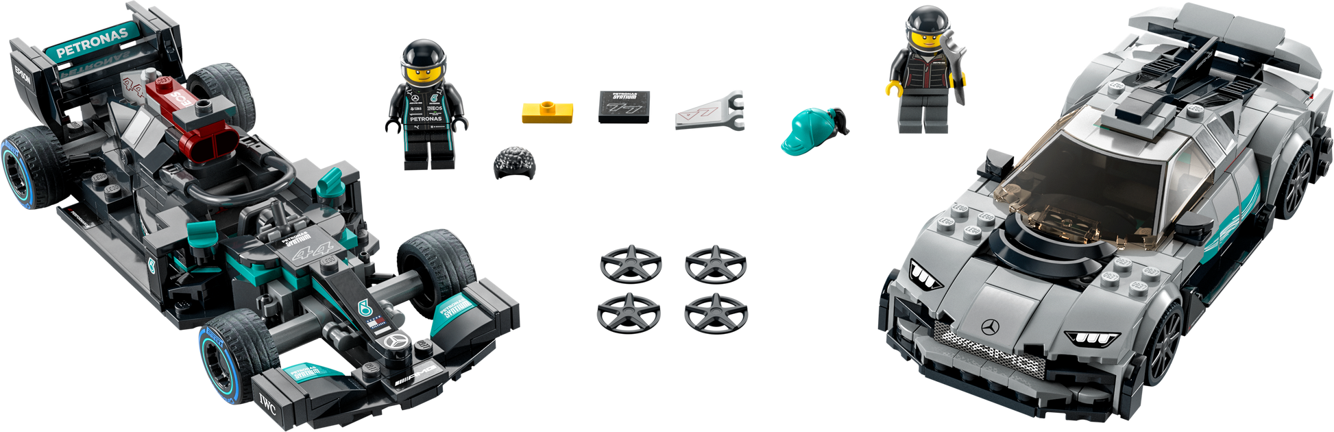 - What’s in the box? – All you need to build a LEGO® recreation of the Mercedes-AMG F1 W12 E Performance and AMG Project One, plus 2 driver minifigures, each with a racing helmet, wig and wrench
