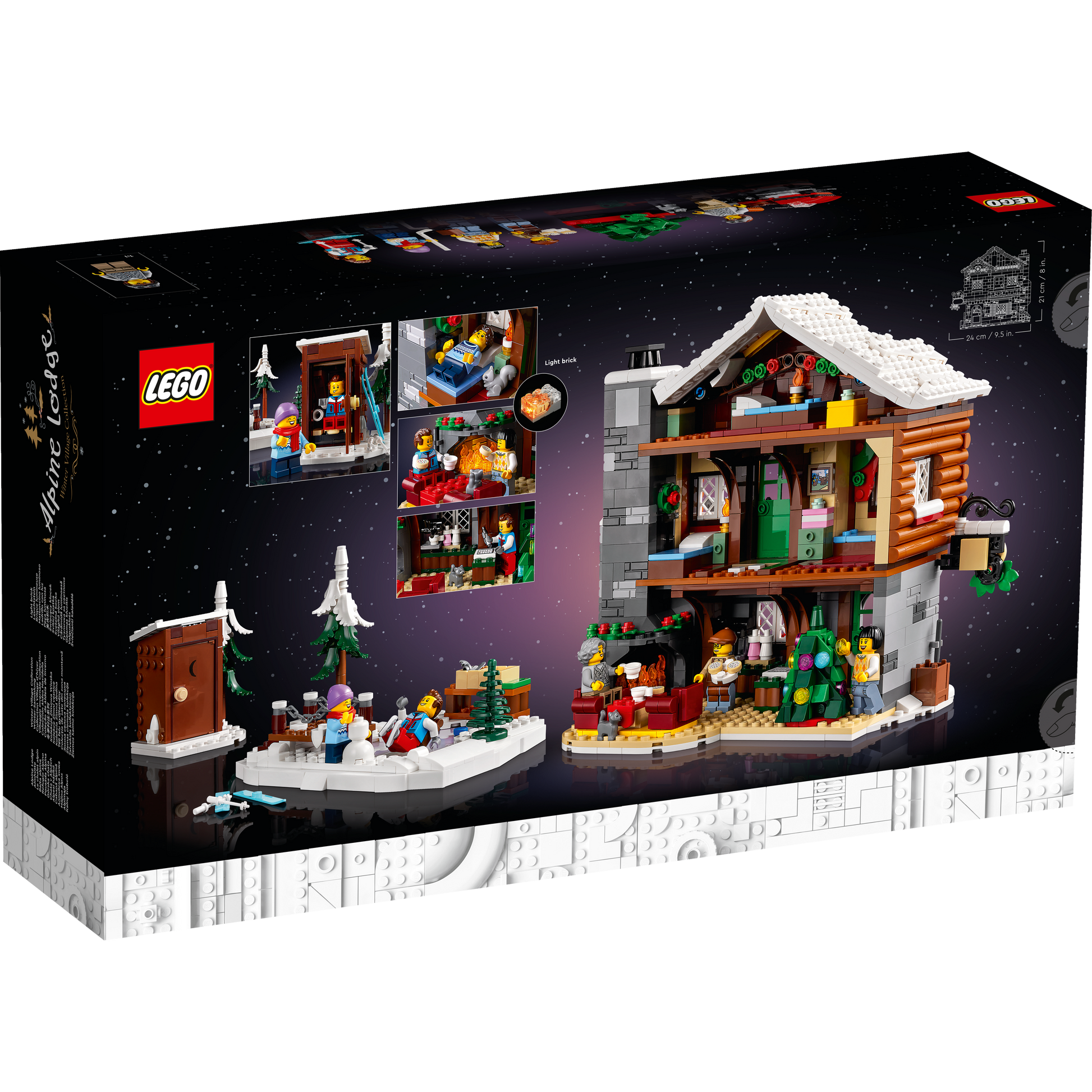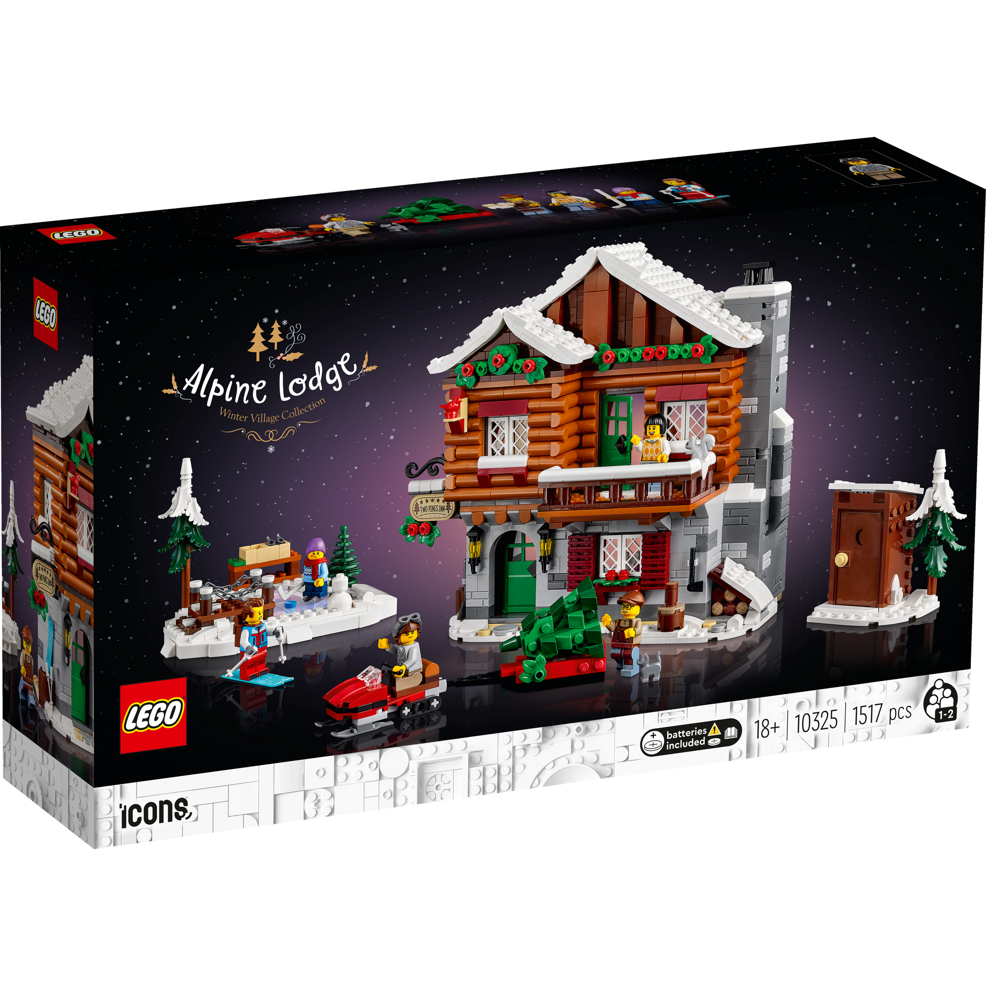 - What’s in the box? – All you need to build the 3-storey alpine lodge, outdoor skating area, toilet cabin, snowmobile and trailer, plus a Christmas tree, 5 minifigures and cat, squirrel and bird figures