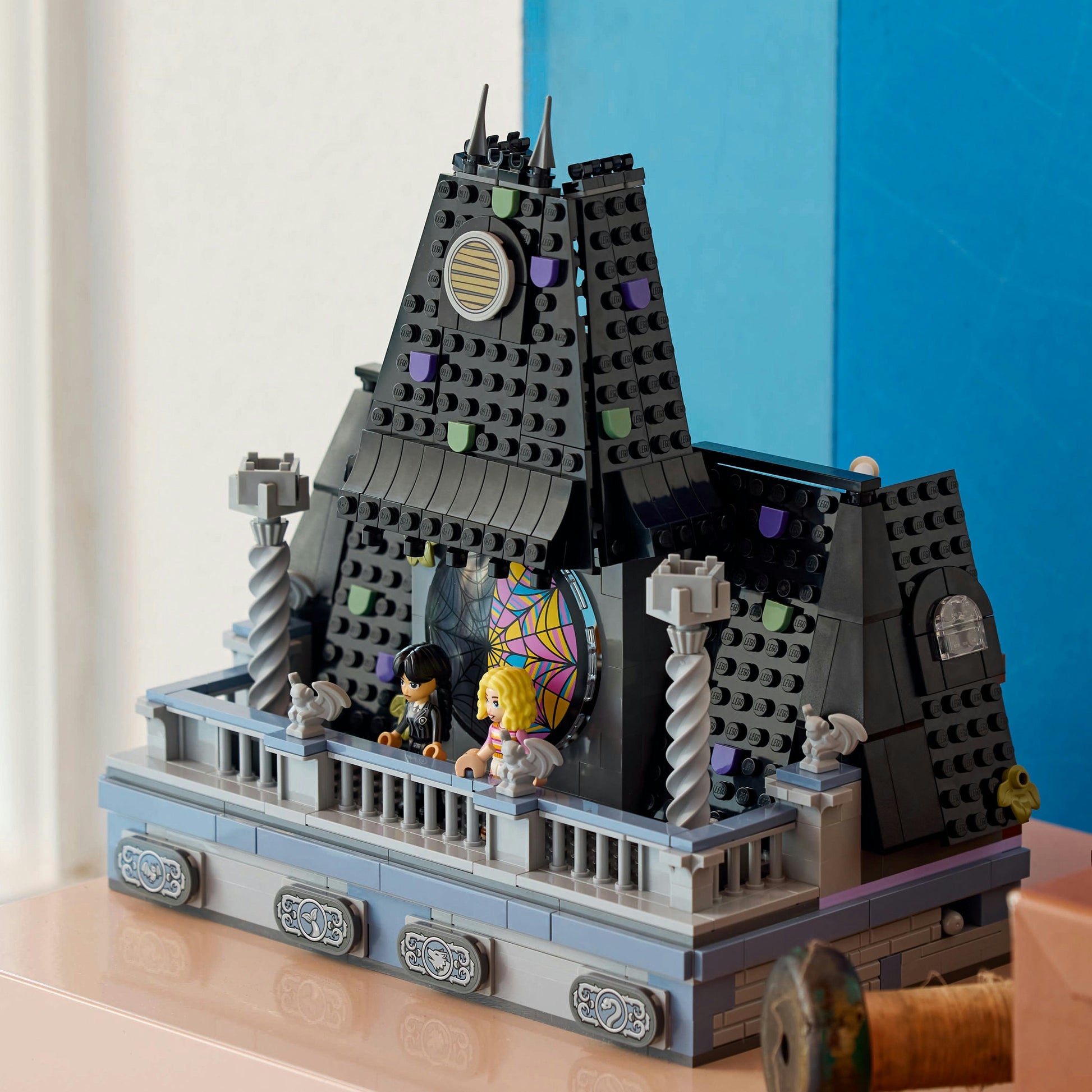 - Nevermore Academy set – The school playset includes a buildable dorm room with a spiderweb window that opens, a base with buttons that open secret drawers and a balcony with 4 gargoyles